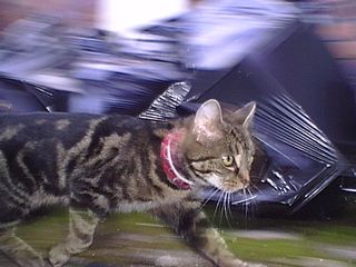 This is Suzie, sadly no longer with us. This cat was strange in many ways. First she refused to go outside without someone accompanying her, and if you moved to sharply she would dart back in to the house. Another problem is that she did like to eat plastic. We were okay tucking the bin bags inside the bins and making certain shopping bags were not left unattended, but when she found that these black things (otherwise known as cassette tapes) had miles of plastic in them we had met out match.